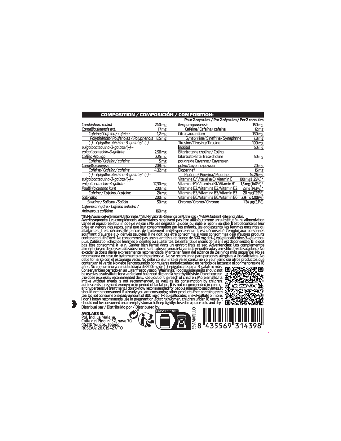 Peso neto: 145 g. Dosis diaria recomendada: 2 cápsulas. Modo de empleo: 1 cápsula antes del desayuno y 1 cápsula antes de la comida con un vaso de agua. Ingredientes: Cápsula (gelatina), extracto seco de resina de guggulsterona (Commiphora mukul), extracto seco de semilla de café verde (Coffea Arabiga), té verde en polvo (Camellia sinensis), extracto seco de semilla de guaraná (Paullinia cupana kunth 12% cafeína), extracto seco de corteza de sauce blanco (Salix alba L.25% salicina), cafeína anhidra, harina de arroz, extracto seco de hierba de mate (Ilex paraguariensis A.St.-Hil.80% cafeína), extracto seco de fruto de naranja amarga (Citrus aurantium L.6% sinefrina), ácido L-ascórbico (Vitamina C), L-tirosina, inositol (mioinositol), colina bitartrato, antiaglomerante (sales magnésicas de ácido grasos), nicotinamida (vitamina B3), cayena en polvo (Capsicum frutescens L.), extracto seco de té verde (Camellia sinensis), BIOPERINE® (extracto seco de fruto de pimienta negra (Piper nigrum L.95% piperina), clorhidrato de piridoxina (vitamina B6), riboflavina (vitamina B2), clorhidrato de tiamina (vitamina B1) y picolinato de cromo. Contiene cafeína (206,5 mg por 2 cápsulas). No recomendado para niños ni mujeres embarazadas. Puede contener trazas de gluten (trigo y avena), frutos de cáscara, cacahuete, huevos, leche, sulfitos, pescado y soja. Lote / Consumir preferentemente antes del fin de: ver envase. Advertencias:Los complementos alimenticios no deben ser utilizados como sustitutos de una dieta variada y equilibrada y un estilo de vida saludable.No exceder la dosis diaria expresamente recomendada.Mantener fuera del alcance de los niños más pequeños.No se recomienda en caso de tratamiento antihipertensivo.No se recomienda para personas alérgicas a los salicilatos.No debe tomarse con el estómago vacío.No debe consumirse si ya se consumen en el mismo día otros productos que contengan té verde.No debe ser consumido por mujeres embarazadas o en periodo de lactancia ni por menores de 18 años. No consumir una cantidad diaria de 800 mg de (–)-epigalocatequina-3-galato o más. Conservar bien cerrado en un lugar fresco y seco.