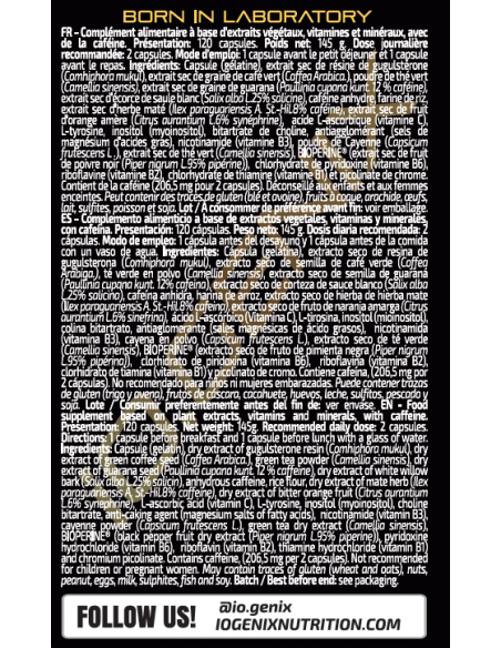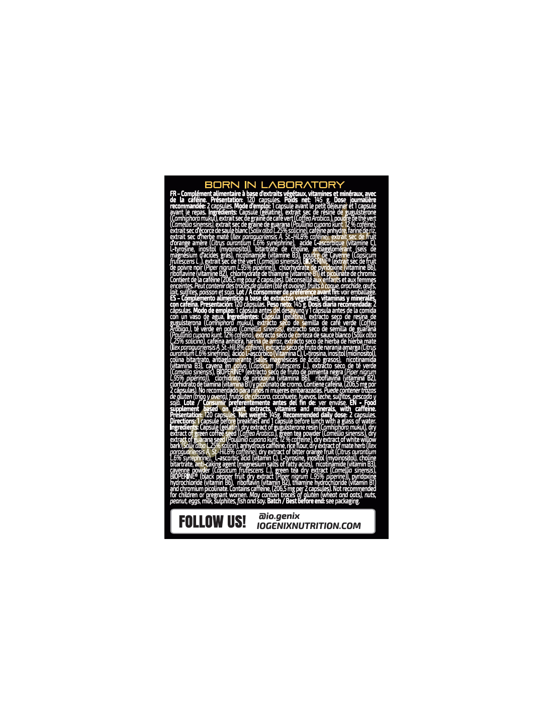 iO.GENIXUn termogénico elaborado a partir de extracto de plantas, vitaminas, minerales y sustancias estimulantes como la cafeína, además cuenta con la patente Bioperine® mejorando la biodisponibilidad del resto de ingredientes.