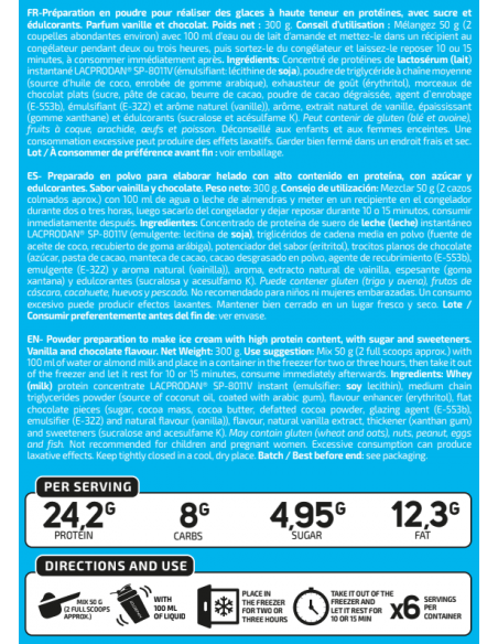 Preparado en polvo para elaborar helado con alto contenido en proteína, con azúcar y edulcorantes. Sabor vainilla y chocolate. Peso neto: 300 g. Consejo de utilización: Mezclar 50 g (2 cazos colmados aprox.) con 100 ml de agua o leche de almendras y meter en un recipiente en el congelador durante dos o tres horas, luego sacarlo del congelador y dejar reposar durante 10 o 15 minutos, consumir inmediatamente después. Ingredientes: Concentrado de proteína de suero de leche (leche) instantáneo LACPRODAN® SP-8011V (emulgente: lecitina de soja), triglicéridos de cadena media en polvo (fuente de aceite de coco, recubierto de goma arábiga), potenciador del sabor (eritritol), trocitos planos de chocolate (azúcar, pasta de cacao, manteca de cacao, cacao desgrasado en polvo, agente de recubrimiento (E-553b), emulgente (E-322) y aroma natural (vainilla)), aroma, extracto natural de vainilla, espesante (goma xantana) y edulcorantes (sucralosa y acesulfamo K). Puede contener gluten (trigo y avena), frutos de cáscara, cacahuete, huevos y pescado. No recomendado para niños ni mujeres embarazadas. Un consumo excesivo puede producir efectos laxantes. Mantener bien cerrado en un lugar fresco y seco. Lote / Consumir preferentemente antes del fin de: ver envase