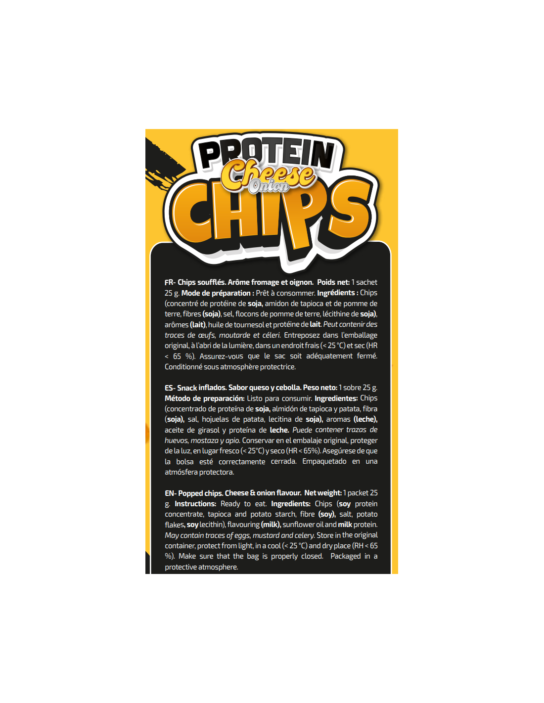 Snack inflados. Sabor queso y cebolla. Peso neto: 1 sobre 25 g. Método de preparación: Listo para consumir. Ingredientes: Chips (concentrado de proteína de soja, almidón de tapioca y patata, fibra (soja), sal, hojuelas de patata, lecitina de soja), aromas (leche), aceite de girasol y proteína de leche. Puede contener trazas de huevos, mostaza y apio. Conservar en el embalaje original, proteger de la luz, en lugar fresco (< 25°C) y seco (HR < 65%). Asegúrese de que la bolsa esté correctamente cerrada. Empaquetado en una atmósfera protectora