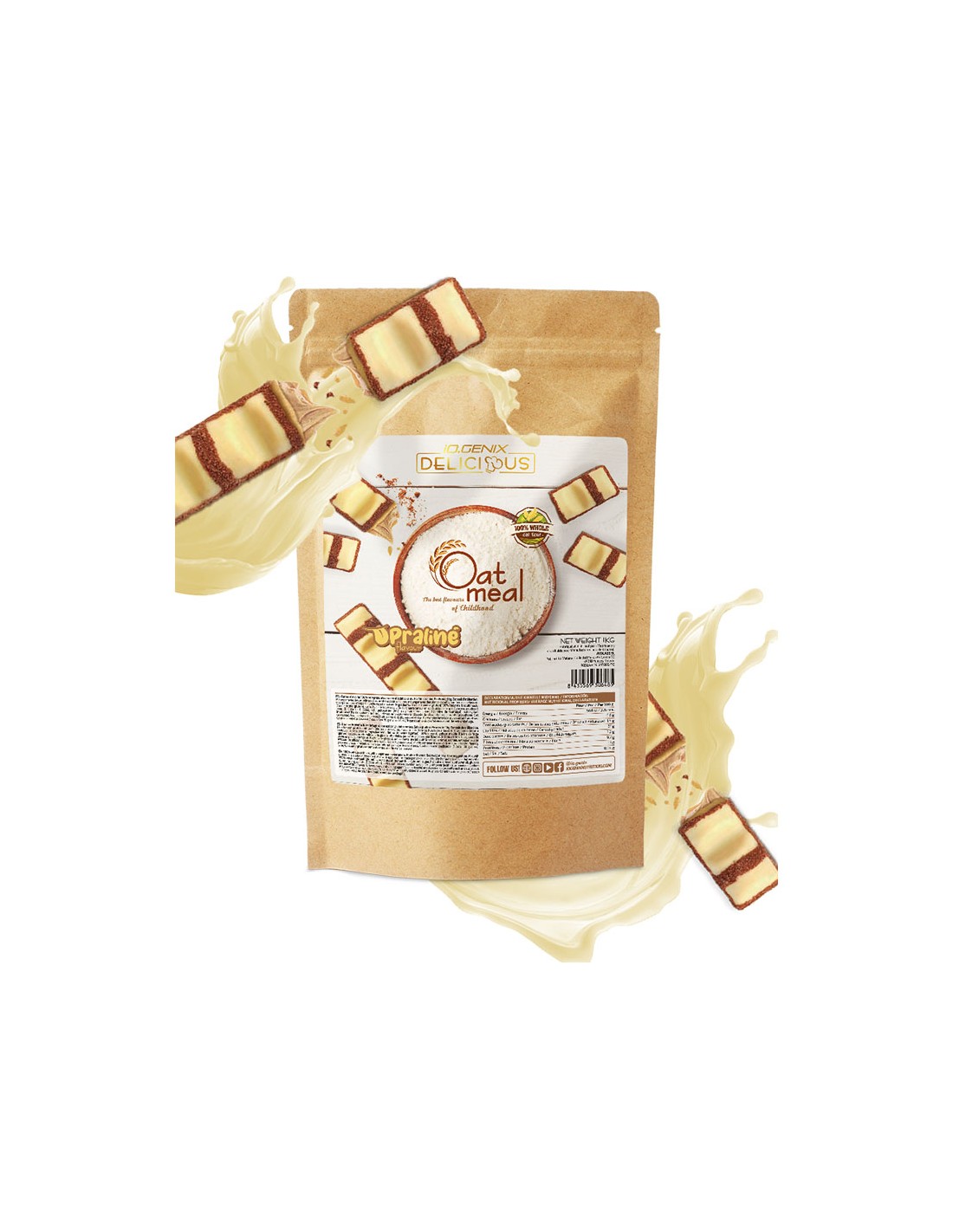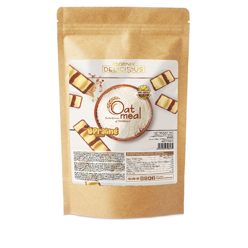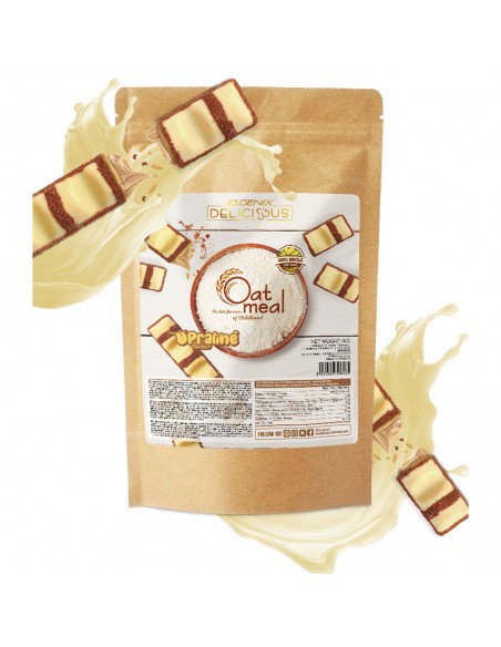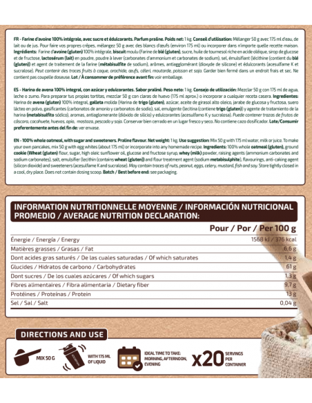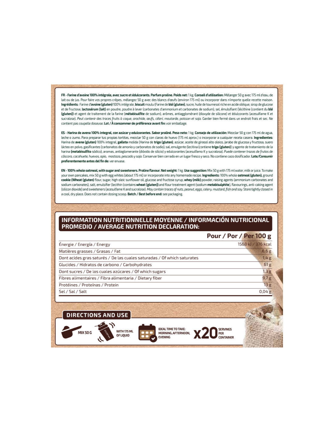 Harina de avena 100% integral, con azúcar y edulcorantes. Sabor praliné. Peso neto: 1 kg. Consejo de utilización: Mezclar con proteína en un batido en el desayuno, mezclar con clara de huevo para hacer tortitas o incorporar a cualquier receta casera. Ingredientes: Harina de avena (gluten) 100% integral, galleta molida (harina de trigo (gluten), azúcar, aceites vegetales (girasol alto oleico y palma), jarabe de glucosa y fructosa, gasificantes (carbonatos de amonio, carbonatos de sodio), sal, emulgente: lecitina (contiene trigo (gluten)), agente de tratamiento de la harina (metabisulfito sódico), colorante: E150d (contiene sulfitos)), aromas, antiaglomerante (dióxido de silicio) y edulcorantes (acesulfamo K y sucralosa). Puede contener trazas de frutos de cáscara, cacahuete, leche, huevos, apio, sulfitos, pescado y soja. Conservar bien cerrado en un lugar fresco y seco. Contiene cazo dosificador (1 cazo= 30 g aprox.). Lote/Consumir preferentemente antes del fin de: ver envase.