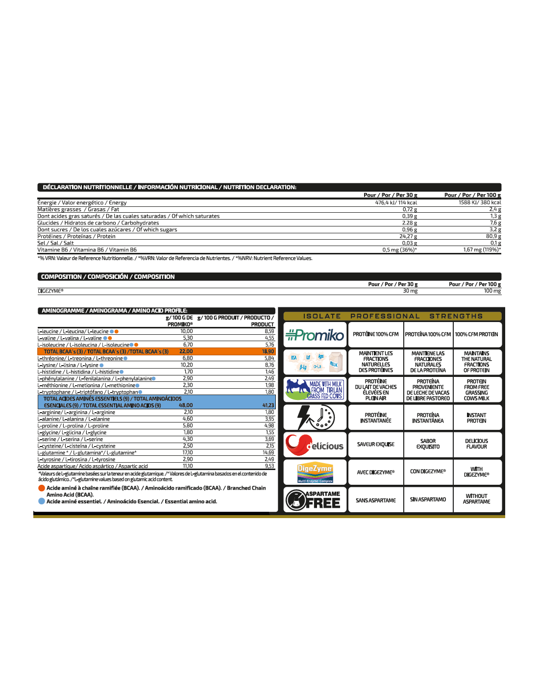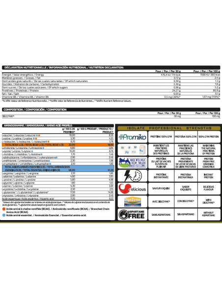 Se trata de un aislado de proteína que utiliza una materia prima única como es PROMIKO ® por su cantidad de proteína pura total después de haberse extraído por la mejor técnica de la actualidad, microfiltración de flujo cruzado (CFM) preservando la calidad de la proteína y un excelente perfil de aminoácidos. Además, hemos añadido el complejo de enzimas digestivas Digezime® y vitamina B6