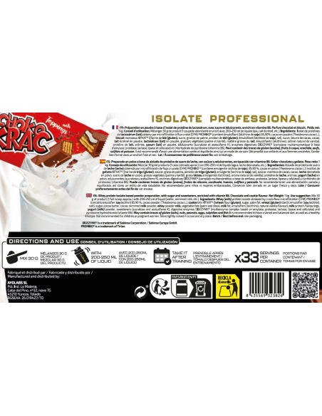Preparado en polvo a base de aislado de proteína de suero de leche, con azúcar y edulcorantes, enriquecido con vitamina B6. Sabor galleta negra. Peso neto: 1 kg. Consejo de utilización: Mezclar 30 g del producto (1 cazo colmado aprox.) con 200-250 ml de líquido (agua, leche desnatada, etc.). Ingredientes: Aislado de proteína de suero de leche (leche) obtenida por microfiltración de flujo cruzado (CFM) PROMIKO® 90,41% (contiene emulgente (lecitina de soja)), galleta de cacao molida (Harina de trigo (gluten), azúcar, grasa de palma, aceite de nabina, cacao magro en polvo 4,3 %, almidón de trigo (gluten), jarabe de glucosa y fructosa, gasificantes (carbonatos de potasio, carbonatos de amonio y carbonatos de sodio), sal, emulgentes (lecitina de soja), corrector de acidez (hidróxido sódico), aroma), aromas, proteína de leche, cacao en polvo (Theobroma cacao L.), yogurt (leche) en polvo, enzimas digestivas DIGEZYME® (complejo multienzimático a base de amilasa, proteasa, lactasa, lipasa y celulasa), edulcorantes (sucralosa y acesulfamo K) y vitamina B6 (clorhidrato de piridoxina). Puede contener trazas de gluten (avena), frutos de cáscara, cacahuete, huevos, mostaza y pescado. No recomendado para niños ni mujeres embarazadas. Conservar bien cerrado en un lugar fresco y seco.