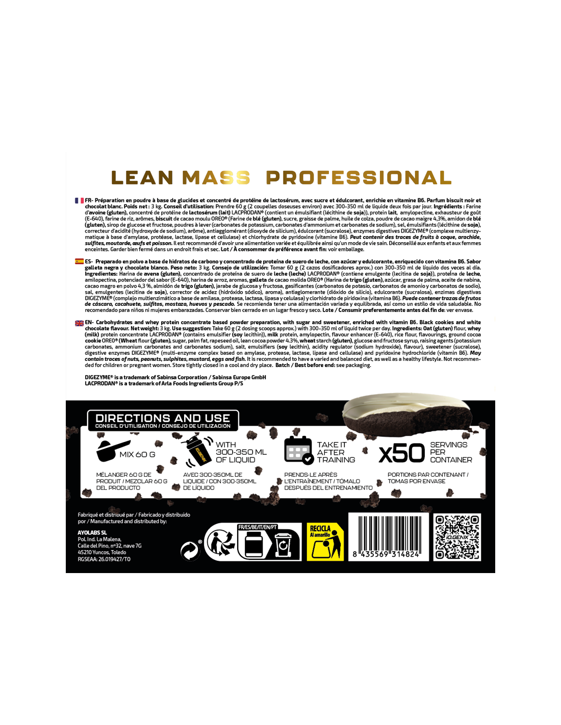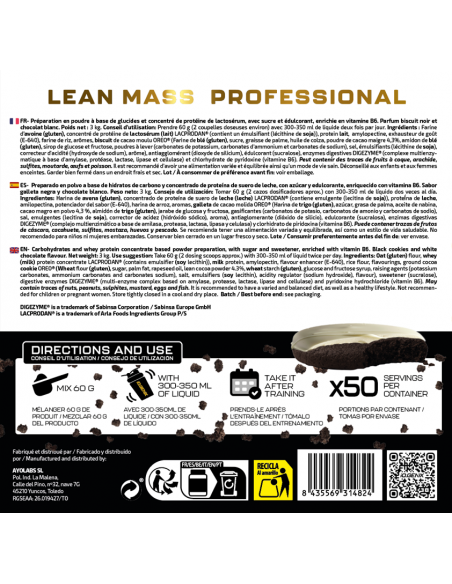 Preparado en polvo a base de hidratos de carbono y concentrado de proteína de suero de leche, con azúcar y edulcorante, enriquecido con vitamina B6. Sabor galleta negra y chocolate blanco. Peso neto: 3 kg. Consejo de utilización: Tomar 60 g (2 cazos dosificadores aprox.) con 300-350 ml de líquido dos veces al día. Ingredientes: Harina de avena (gluten), concentrado de proteína de suero de leche (leche) LACPRODAN® (contiene emulgente (lecitina de soja)), proteina de leche, amilopectina, potenciador del sabor (E-640), harina de arroz, aromas, galleta de cacao molida (Harina de trigo (gluten), azúcar, grasa de palma, aceite de nabina, cacao magro en polvo 4,3 %, almidón de trigo (gluten), jarabe de glucosa y fructosa, gasificantes (carbonatos de potasio, carbonatos de amonio y carbonatos de sodio), sal, emulgentes (lecitina de soja), corrector de acidez (hidróxido sódico), aroma), antiaglomerante (dióxido de silicio), edulcorante (sucralosa), enzimas digestivas DIGEZYME ® (complejo multienzimático a base de amilasa, proteasa, lactasa, lipasa y celulasa), y vitamina B6 (clorhidrato de piridoxina). Puede contener trazas de frutos de cáscara, cacahuete, sulfitos, apio, mostaza, huevos y pescado. No recomendado para niños ni mujeres embarazadas. Conservar bien cerrado en un lugar fresco y seco. Lote / Consumir preferentemente antes del fin de: ver envase.