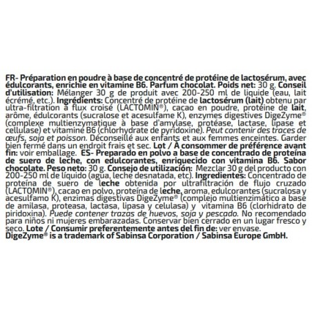 Preparado en polvo a base de concentrado de proteína de suero de leche, con edulcorantes, enriquecido con vitamina B6. Sabor chocolate. Peso neto: 30 g. Consejo de utilización: Mezclar 30 g del producto (1 cazo colmado aprox.) con 200-250 ml de líquido (agua, leche desnatada, etc). Ingredientes: Concentrado de proteína de suero de leche obtenida por ultrafiltración de flujo cruzado (LACTOMIN®), cacao en polvo, proteína de leche, aroma, edulcorantes (sucralosa y acesulfamo K), enzimas digestivas DigeZyme® (complejo multienzimático a base de amilasa, proteasa, lactasa, lipasa y celulasa) y vitamina B6 (clorhidrato de piridoxina). Puede contener trazas de huevos, soja y pescado. No recomendado para niños ni mujeres embarazadas. Conservar bien cerrado en un lugar fresco y seco. Lote / Consumir preferentemente antes del fin de: ver envase.