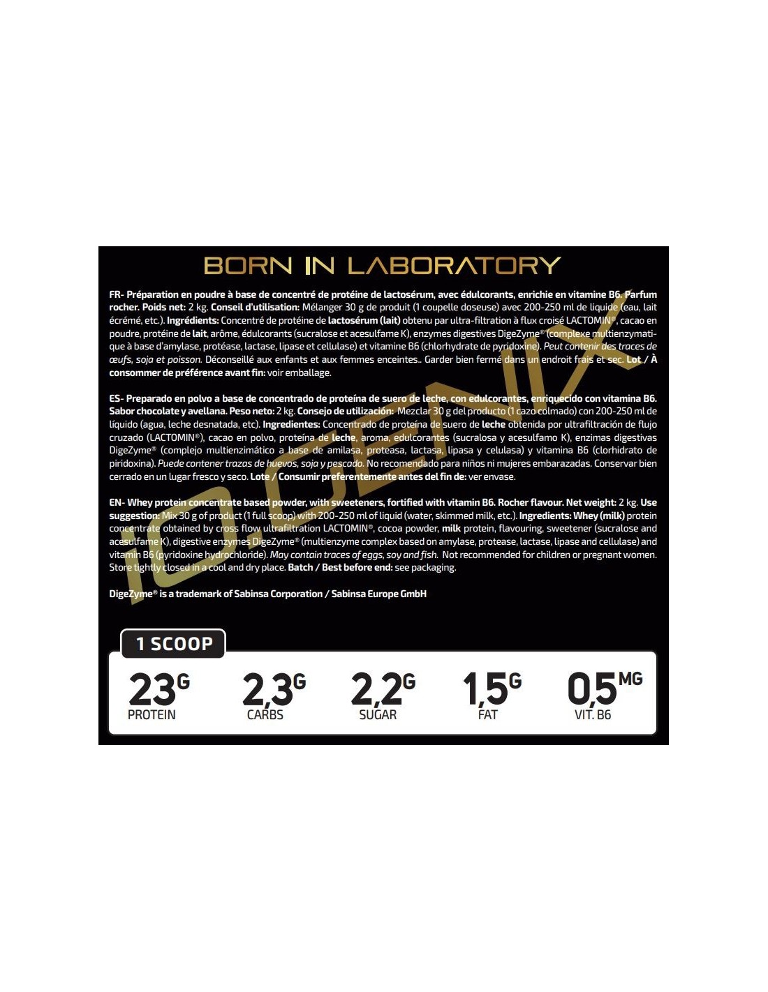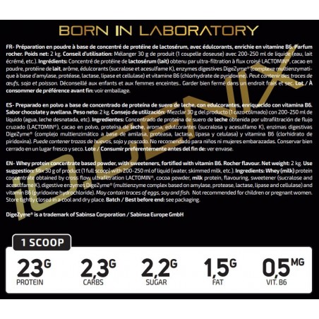 Preparado en polvo a base de concentrado de proteína de suero de leche, con edulcorantes, enriquecido con vitamina B6. Sabor chocolate. Peso neto: 2 kg. Consejo de utilización: Mezclar 30 g del producto (1 cazo colmado aprox.) con 200-250 ml de líquido (agua, leche desnatada, etc). Ingredientes: Concentrado de proteína de suero de leche obtenida por ultrafiltración de flujo cruzado (LACTOMIN®), cacao en polvo, proteína de leche, aroma, edulcorantes (sucralosa y acesulfamo K), enzimas digestivas DigeZyme® (complejo multienzimático a base de amilasa, proteasa, lactasa, lipasa y celulasa) y vitamina B6 (clorhidrato de piridoxina). Puede contener trazas de huevos, soja y pescado. No recomendado para niños ni mujeres embarazadas. Conservar bien cerrado en un lugar fresco y seco. Lote / Consumir preferentemente antes del fin de: ver envase.