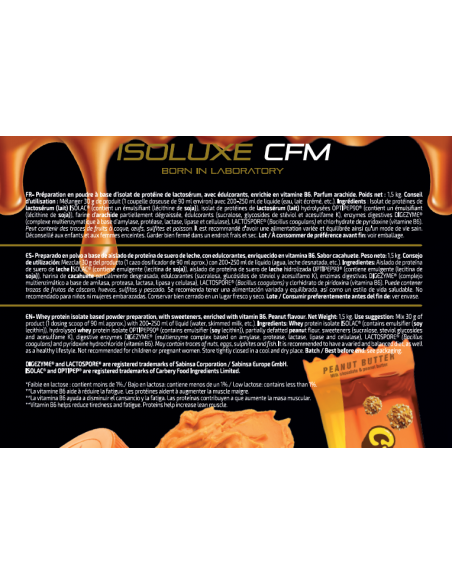 Preparado en polvo a base de aislado de proteína de suero de leche, con edulcorantes, enriquecido en vitamina B6. Sabor cacahuete. Peso neto: 1,5 kg. Consejo de utilización: Mezclar 30 g del producto (1 cazo dosificador de 90 ml aprox.) con 200–250 ml de líquido (agua, leche desnatada, etc.). Ingredientes: Aislado de proteína de suero de leche ISOLAC® (contiene emulgente (lecitina de soja)), aislado de proteína de suero de leche hidrolizada OPTIPEP®90® (contiene emulgente (lecitina de soja)), harina de cacahuete parcialmente desgrasada, edulcorantes (sucralosa, glucósidos de esteviol y acesulfamo K), enzimas digestivas DIGEZYME® (complejo multienzimático a base de amilasa, proteasa, lactasa, lipasa y celulasa), LACTOSPORE® (Bacillus coagulans) y clorhidrato de piridoxina (vitamina B6). Puede contener trazos de frutos de cáscara, huevos, sulfitos y pescado. Se recomienda tener una alimentación variada y equilibrada, así como un estilo de vida saludable. No recomendado para niños ni mujeres embarazadas. Conservar bien cerrado en un lugar fresco y seco. Lote / Consumir preferentemente antes del fin de: ver envase.