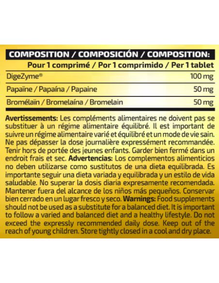 Complemento alimenticio a base de enzimas digestivas. Peso neto: 27 g. Presentación: 60 comprimidos. Dosis diaria recomendada: 1 comprimido. Modo de empleo: Tomar 1 comprimido al día con un vaso de agua. Ingredientes: Maltodextrina, DIGEZYME® (complejo multienzimá - tico a base de amilasa, proteasa, lactasa, lipasa y celulasa), papaína y bromelaína. bromelaína. Puede contener trazas de gluten (trigo y avena), frutos de cáscara, cacahuete, huevos, leche, sulfitos, pescado y soja. Lote / Consumir preferentemente antes del fin de: ver envase. c. Advertencias: Los complementos alimenticios no deben utilizarse como sustitutos de una dieta equilibrada. Es importante seguir una dieta variada y equilibrada y un estilo de vida saludable. No superar la dosis diaria expresamente recomendada. Mantener fuera del alcance de los niños más pequeños. Conservar bien cerrado en un lugar fresco y seco
