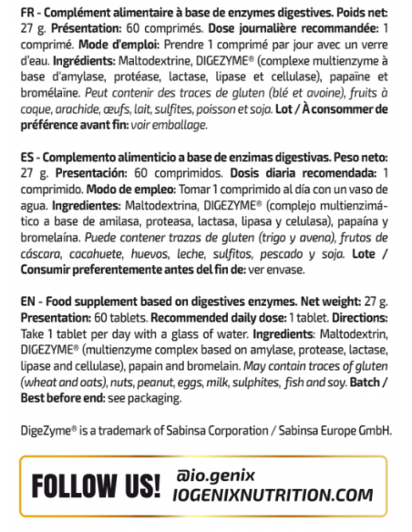 iO.GENIXEnzimas digestivas, un producto elaborado a partir de un complejo multienzimático líder del sector como es digezyme ® asegurando la procedencia y calidad de todas sus enzimas digestivas, además le hemos añadido papaína y bromelaína, dos enzimas proteolíticas que actúan sinérgicamente