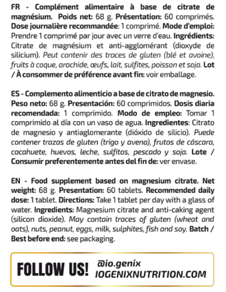 iO.GENIXEl citrato de magnesio es un complemento alimenticio formado por ácido cítrico y magnesio, ideal para todas las personas que quieran ingerir magnesio de una forma fácil en forma de tabletas.